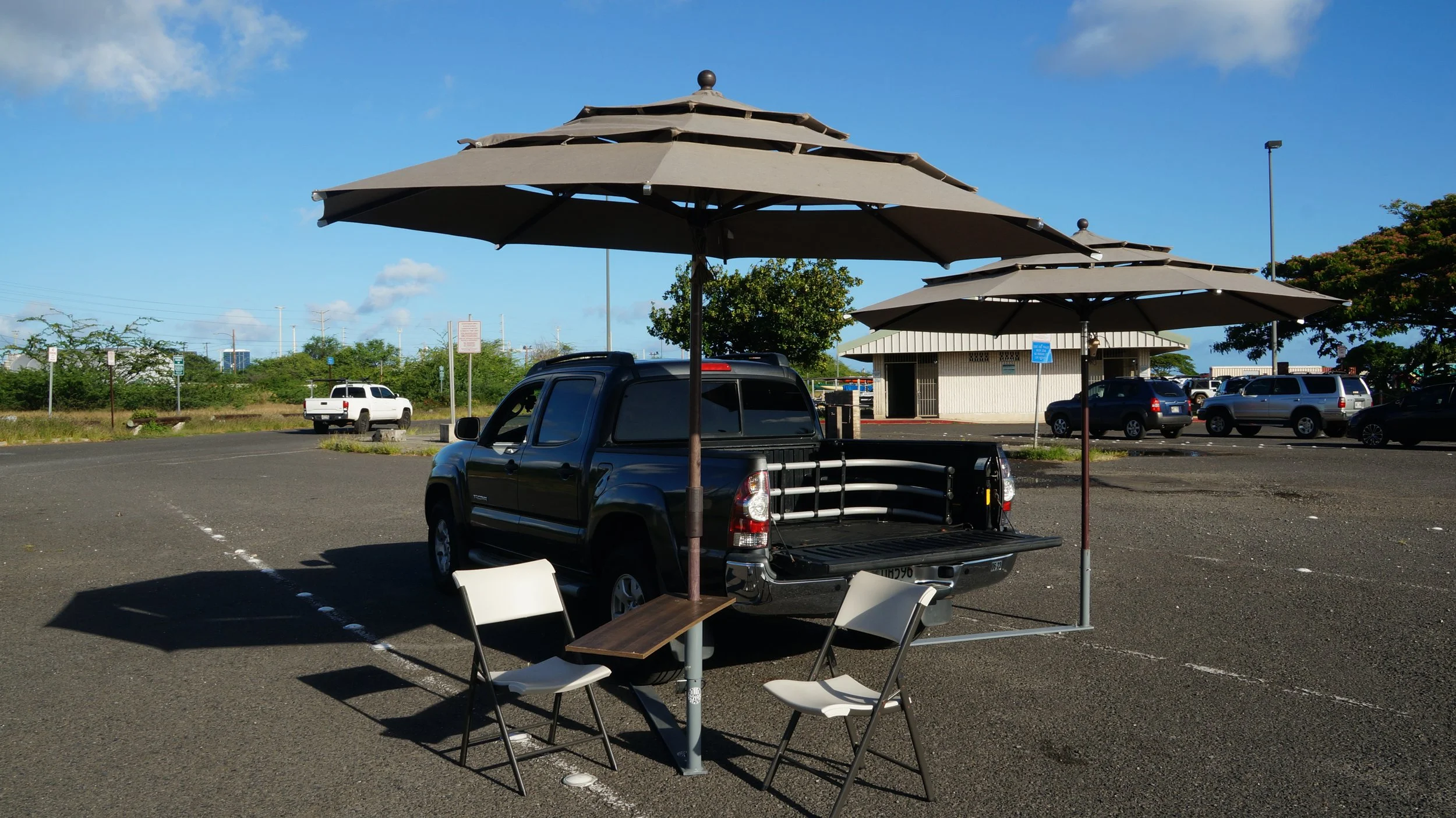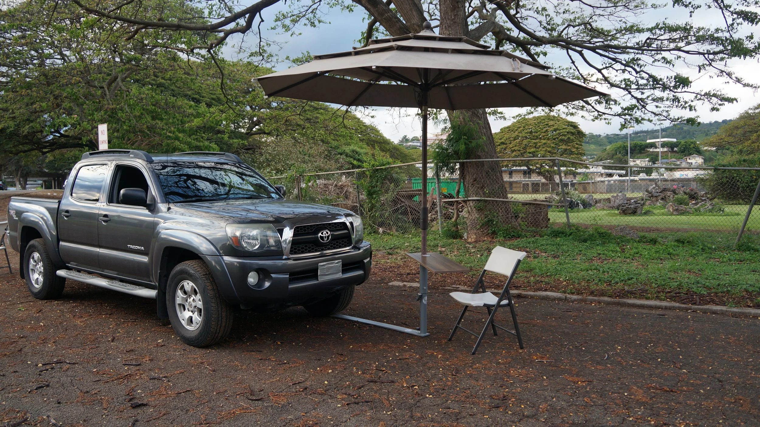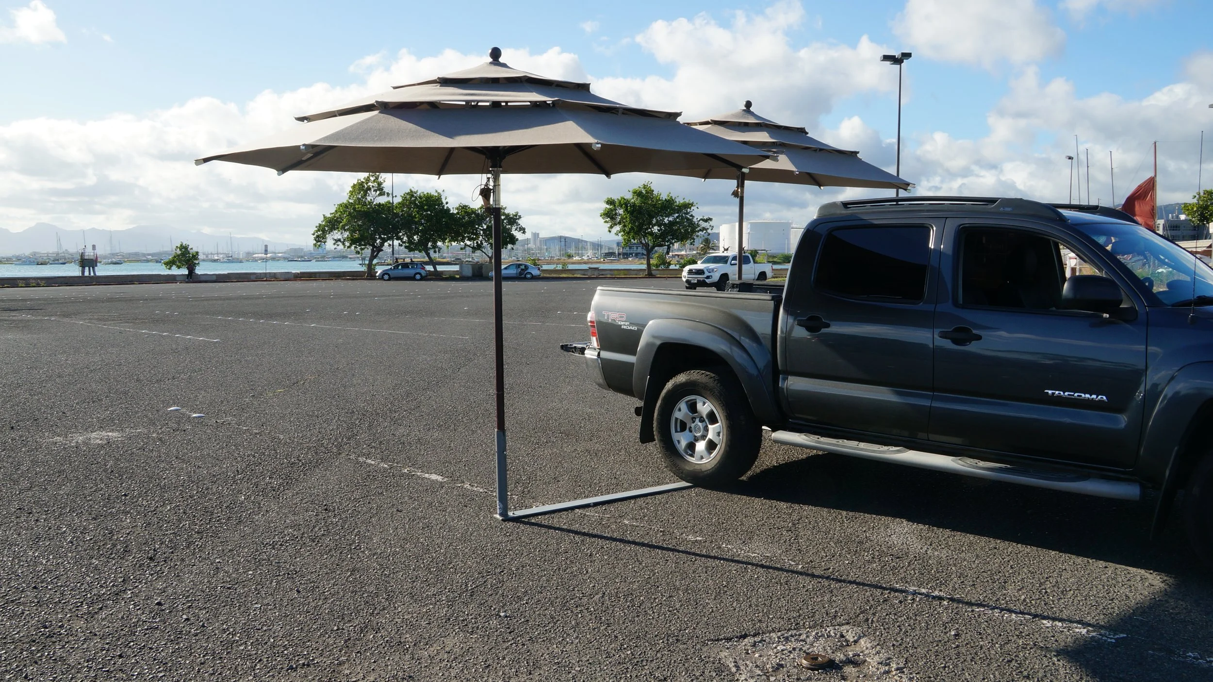 Can be used with PROSHADE 11ft umbrella with tilt (Costco), Fan, table, Lights, and Flagpole.