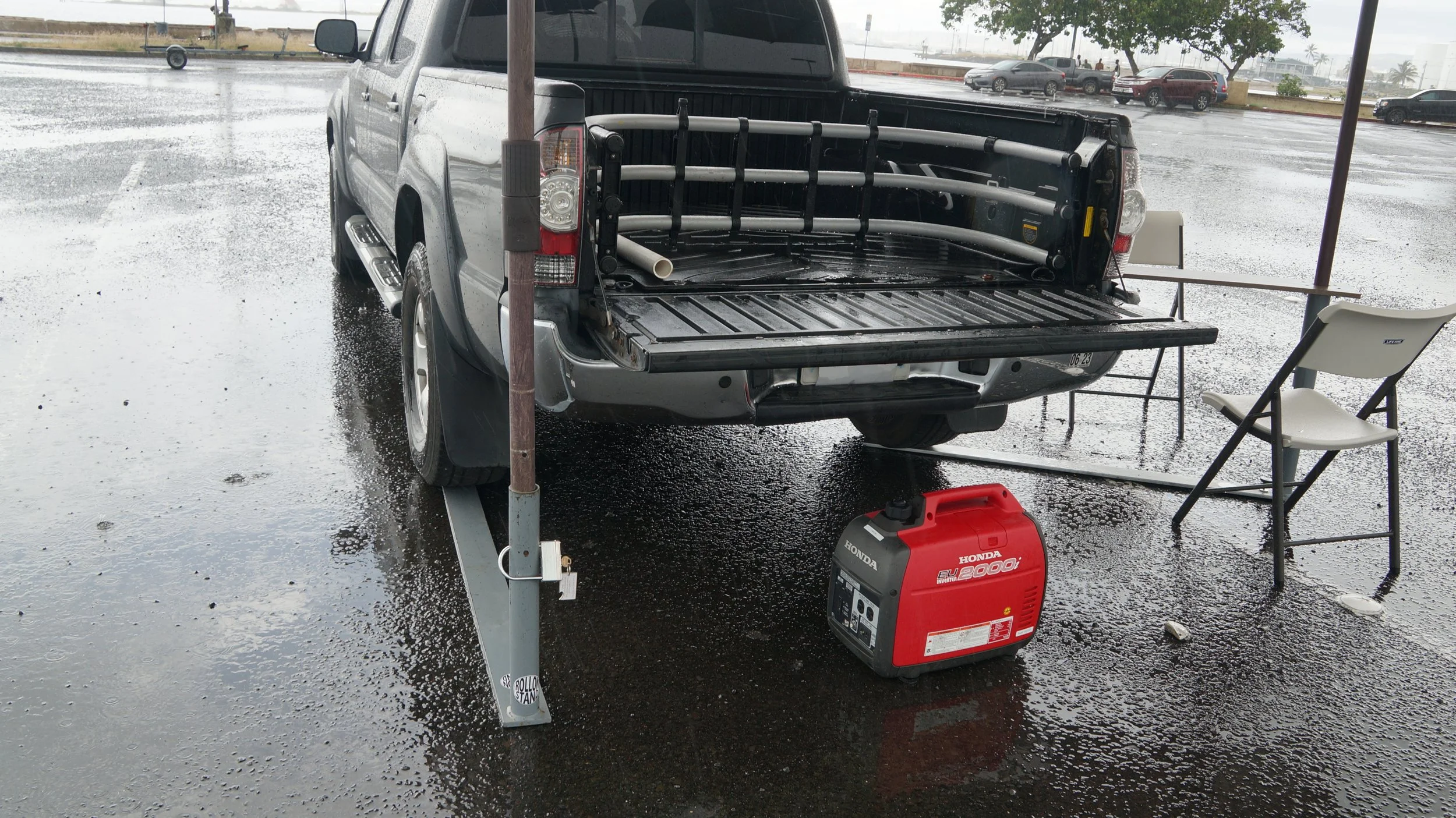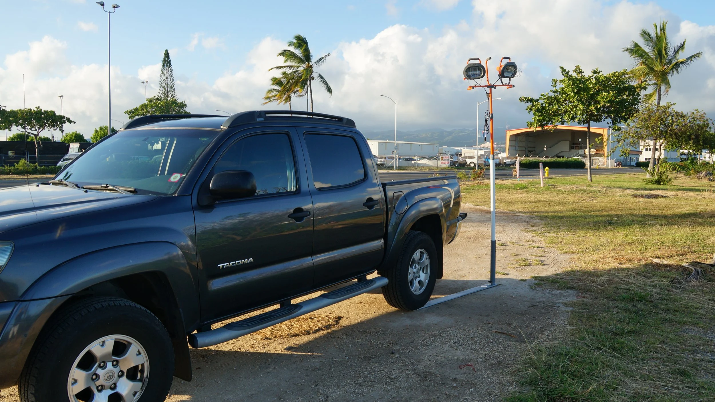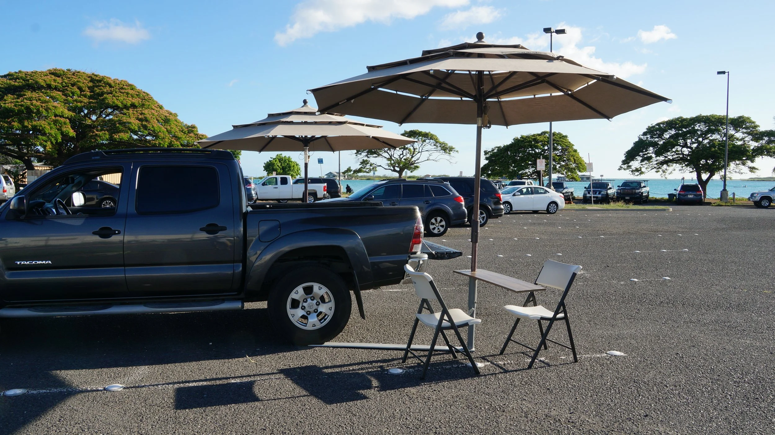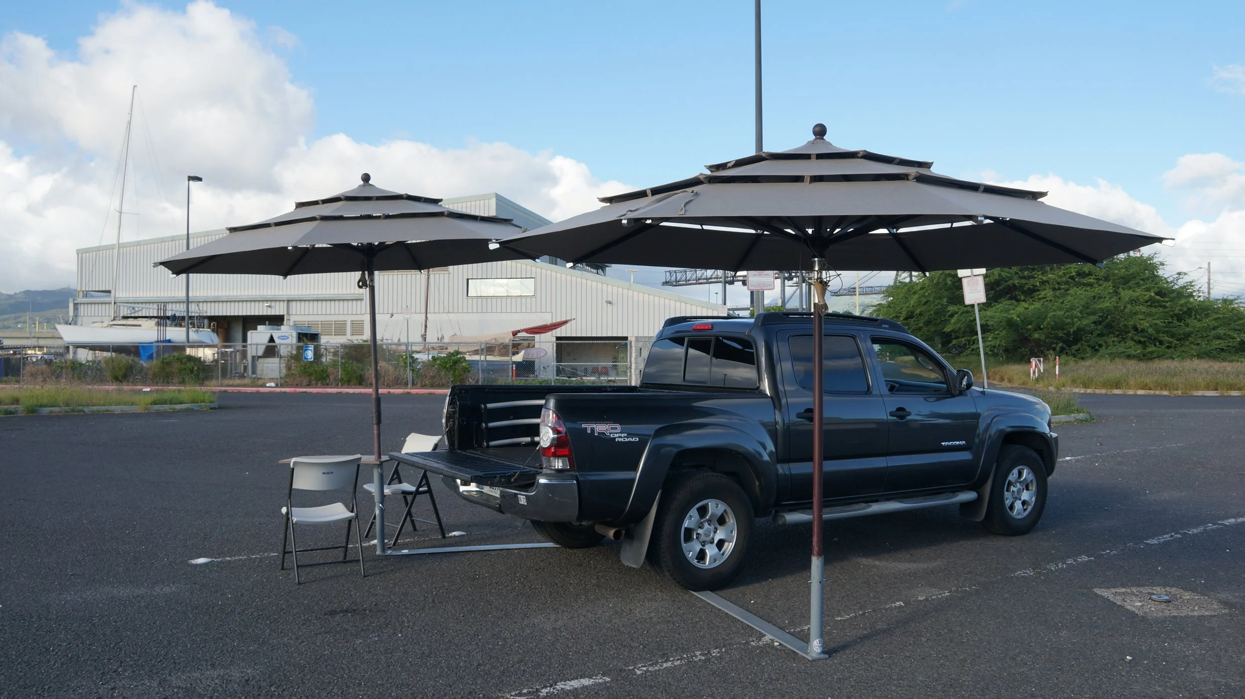 Can be used with PROSHADE 11ft umbrella with tilt (Costco), Fan, table, Lights, and Flagpole.